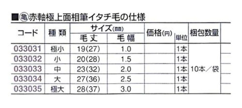 製品仕様 商品名 好川産業株式会社 【亀】赤軸極上面相筆イタチ毛 1本【好川産業株式会社】 内容量1本 種類極小 毛丈19(27)mm 毛幅1.0mm 梱包数量10本/袋 ご注意事項モニターの発色の具合によって実際のものと色が異なる場合がございます。
